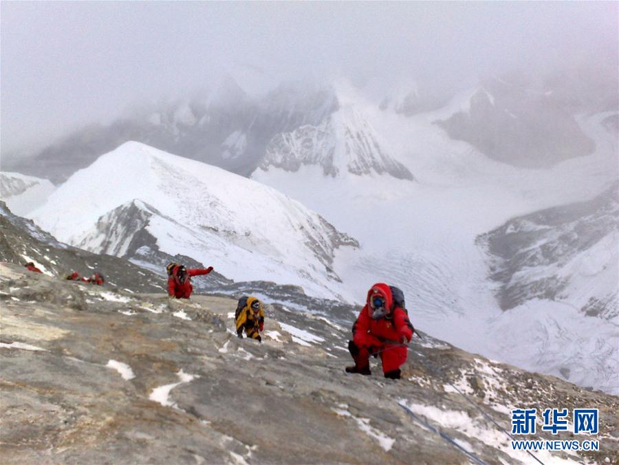 1960年5月25日,中国登山运动员王富洲、贡布、屈银华三人首次从北坡登上珠穆朗玛峰,创造了人类历史上第一次从北坡登上世界第一高峰的壮举。登山勇士们不畏险阻、一往无前的精神,鼓舞着一代代登山人向着珠穆朗玛峰前进。 这是2008年5月27日,登山队员通过架设在海拔8700米珠峰第二台阶的“中国梯”向上攀登。 新华社发