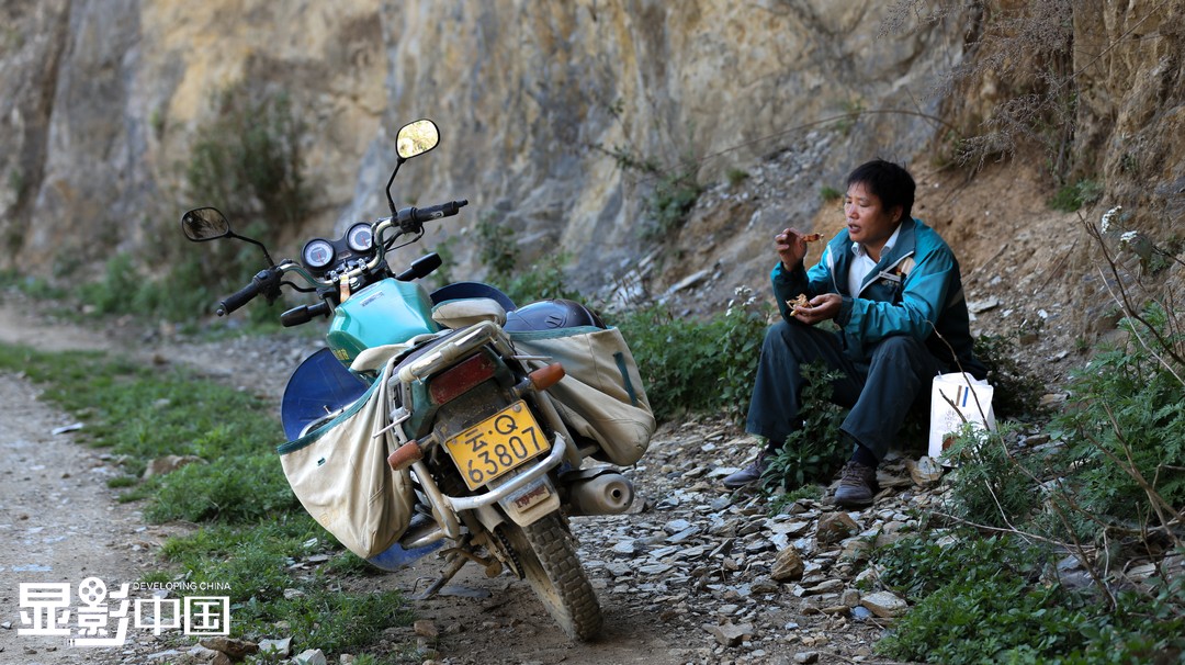 尽管邮路艰辛,但桑南才从未想过放弃,“自己选择的路,酸甜苦辣也要坚持走到底!”图为桑南才送件途中休息吃干粮(5月10日摄)。