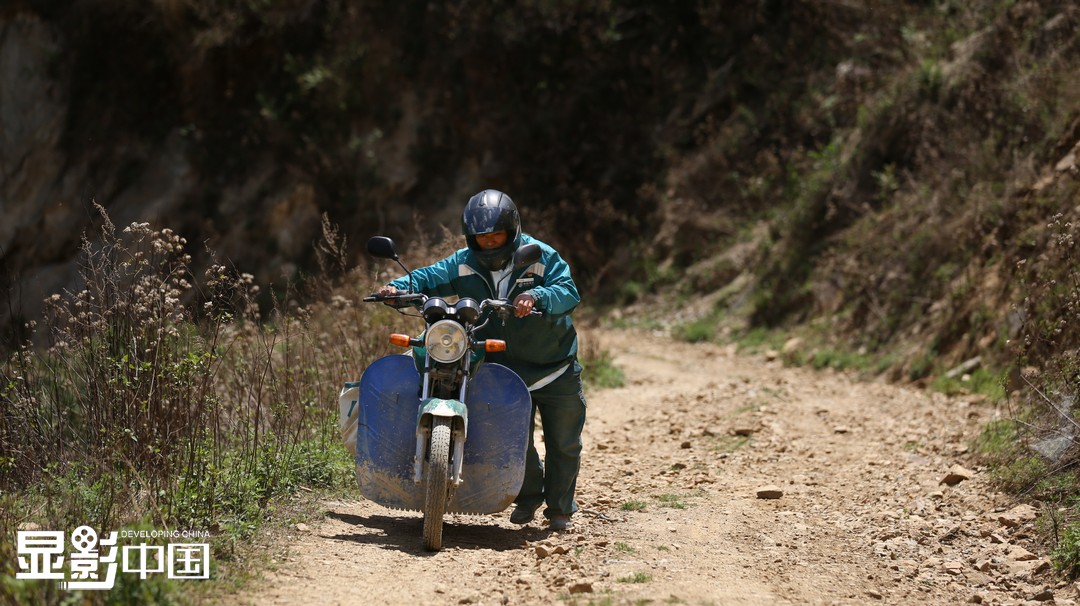 现在桑南才主要靠骑摩托车送邮件,送件效率大为提升,但危险系数也增加了。峡谷邮路弯急坡陡、危石嶙峋,从2001年至今,桑南才已经骑坏了五辆摩托车,第一辆更是骑了三天就摔报废了。图为桑南才推车上陡坡(5月10日摄)。