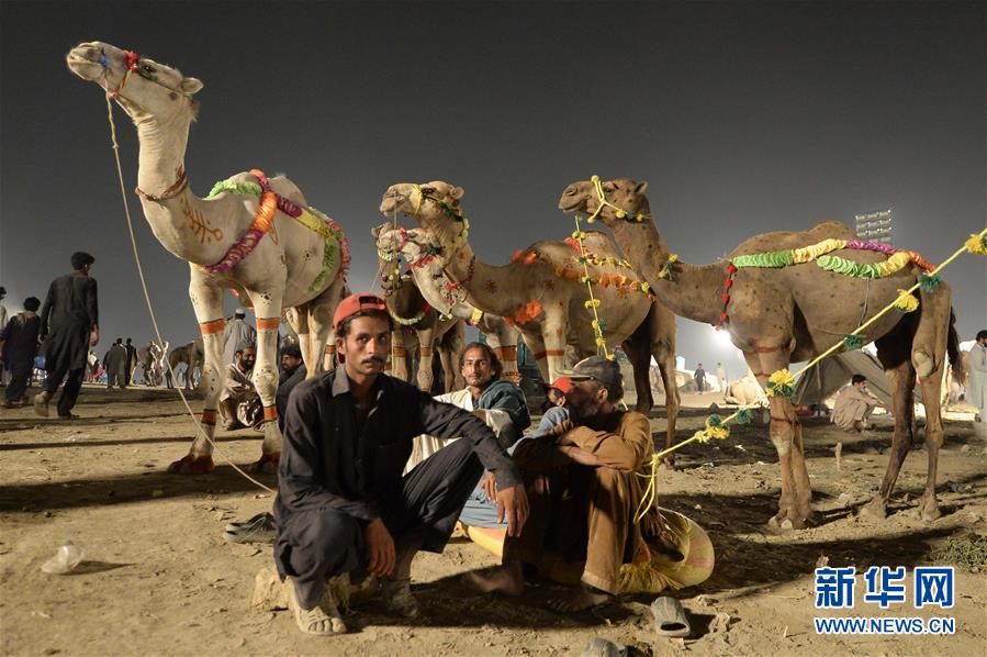 7月25日,在宰牲节来临之际,骆驼商贩在巴基斯坦伊斯兰堡的一个牲畜市场等待顾客。 新华社发(艾哈迈德·卡迈勒摄)