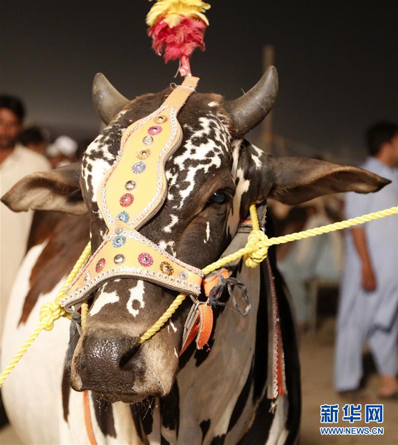 这是7月25日在巴基斯坦伊斯兰堡一个牲畜市场拍摄的一头佩戴饰品的牛。 新华社发(艾哈迈德·卡迈勒摄)