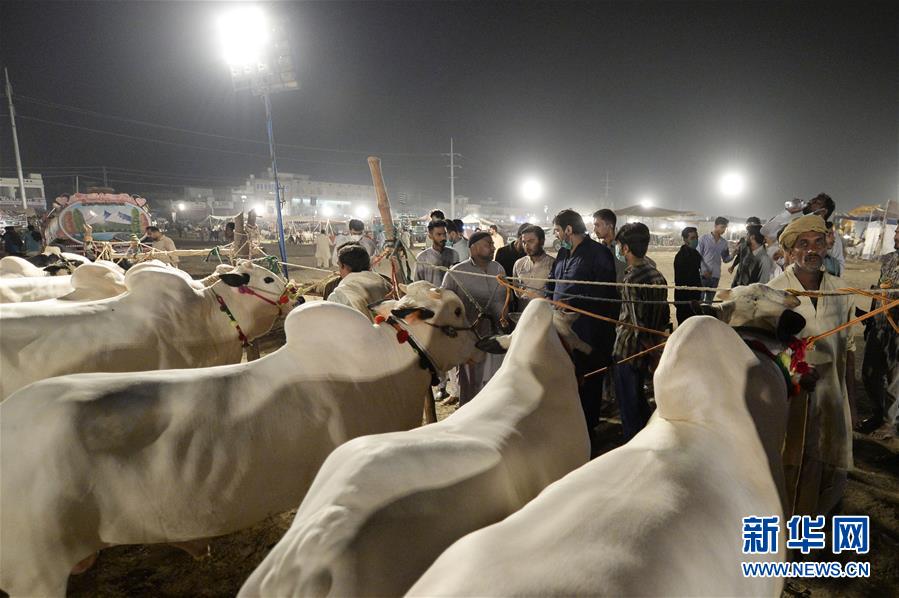 7月25日,在宰牲节来临之际,人们在巴基斯坦伊斯兰堡的一个牲畜市场挑选牛。 新华社发(艾哈迈德·卡迈勒摄)