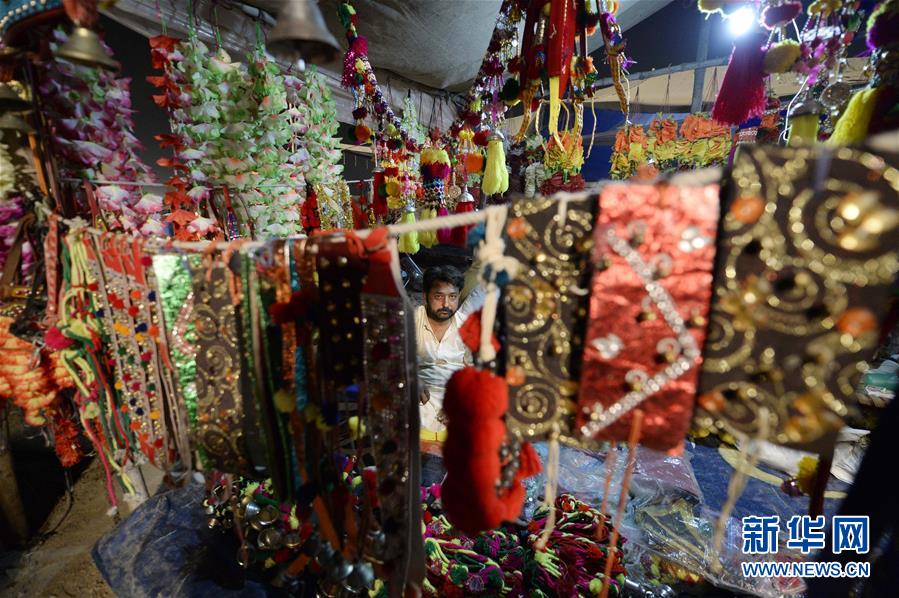 7月25日,在宰牲节来临之际,一名商贩在巴基斯坦伊斯兰堡的一个牲畜市场售卖牲畜饰品。 新华社发(艾哈迈德·卡迈勒摄)