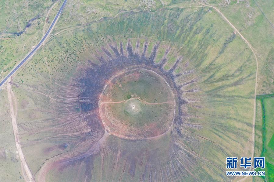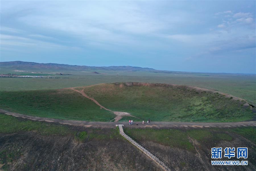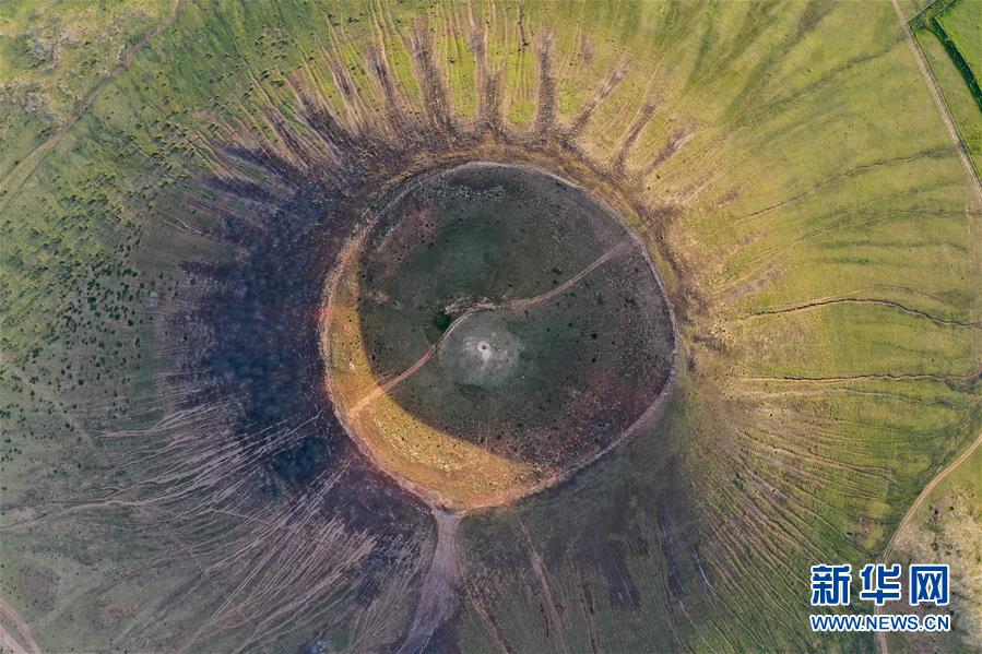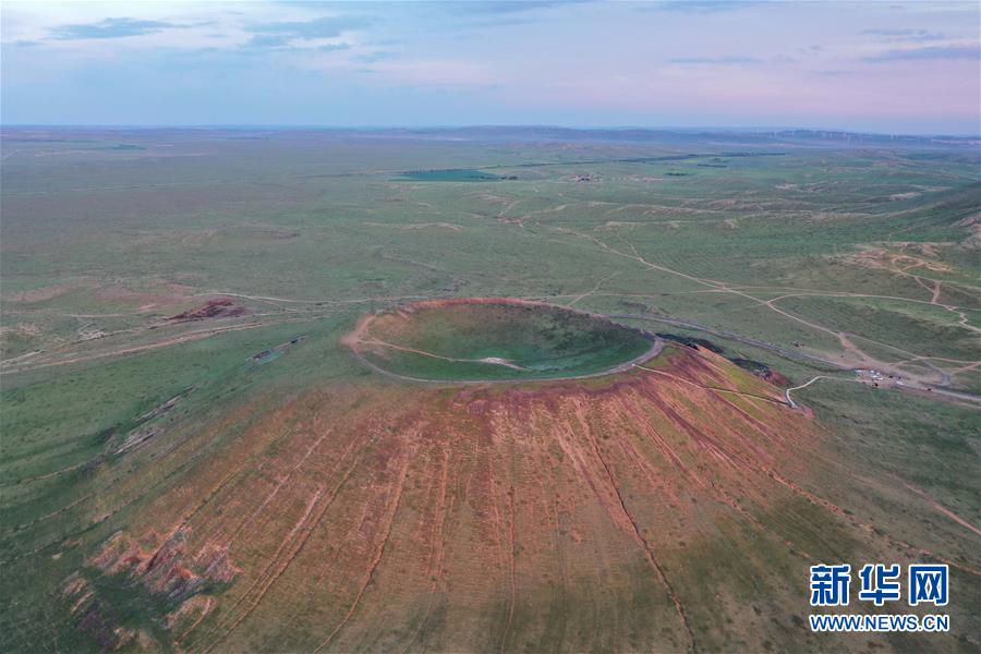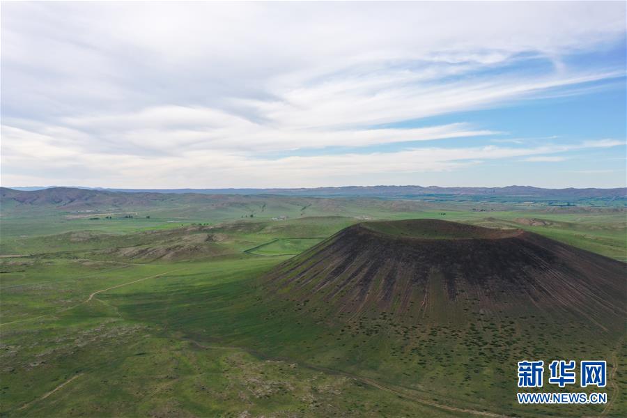 这是乌兰哈达火山群的一处火山口(7月29日摄,无人机照片)。 乌兰哈达火山群位于内蒙古自治区乌兰察布市察哈尔右翼后旗的草原上。夏日里,绿草青青,一碧千里,坐落在草原上的火山与周边的风景构成一幅幅壮美画卷。 新华社记者 徐钦 摄