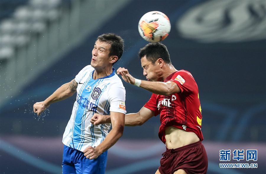 8月17日晚,2020赛季中超联赛第一阶段第五轮比赛战罢。14日在大连结束的两场比赛中,莫雷诺用一脚推射帮助上海申花一球小胜江苏苏宁;而另一场比赛中,替补登场的韦世豪连入两球,帮助广州恒大3:1轻取河南建业。15日,大连突降暴雨,大连人与广州富力的比赛顺延至16日下午举行。而在另一个场地,山东鲁能与深圳佳兆业在大雨中进行了比赛,凭借佩莱和刘彬彬的两粒进球,鲁能击败了刚刚换帅的深圳佳兆业队。16日,大连赛区第五轮的最后一场比赛中,广州富力凭借扎哈维的点球1:0击败大连人,终于迎来赛季首胜。苏州赛区16日上演了两场“升班马”逆袭的好戏:青岛黄海青港在落后3球的情况下,连追3球将比分扳平,宣告国安全胜战绩的终结;石家庄永昌1:1逼平上海上港,同样爆冷拿分。17日,苏州迎来第五轮最后两场比赛,河北华夏幸福在与泰达的直接交锋中2:0获胜,而重庆当代则是两球输给武汉卓尔。 河北华夏幸福 2-0 天津泰达 8月17日,在中超联赛第一阶段苏州赛区第五轮最后一场比赛中, 河北华夏幸福对阵天津泰达。 面对本赛季同样一胜难求的河北华夏幸福,泰达在上半场就丢了两球,先是高拉特在第36分钟头球洞穿泰达大门,随后在上半场补时阶段,马尔考点球扩大战果。 泰达队最为倚重的“快马”、进攻核心阿奇姆彭在踢了30分钟就因伤下场,这对于本赛季外援人数最少的泰达来说,无异于雪上加霜。下半场,泰达几无还手之力,最终0:2告负,送给对手赛季首胜,而自己五轮过后仅1平4负,在苏州赛区垫底。 图为8月17日,河北华夏幸福队球员潘喜民(右)在比赛中与天津泰达队球员肖智争顶。 新华社记者杨磊摄