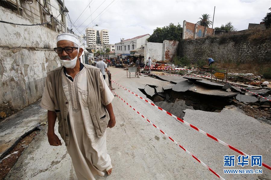 9月8日,阿尔及利亚首都阿尔及尔一处路面在暴雨中塌陷。 阿尔及利亚首都阿尔及尔7日发生强降雨,部分地区道路和房屋受损。 新华社发