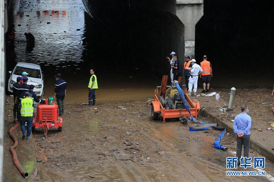 9月8日,工作人员在阿尔及利亚首都阿尔及尔一座立交桥下排水。 阿尔及利亚首都阿尔及尔7日发生强降雨,部分地区道路和房屋受损。 新华社发