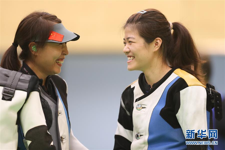 9月26日,冠军山东队选手张佳琪(右)与亚军国家集训队选手张彬彬在比赛后。 当日,在湖北宜昌进行的2020年全国射击冠军赛(步枪项目)女子50米步枪三种姿势决赛中,山东队选手张佳琪以463.4环的总成绩夺得冠军,国家集训队选手张彬彬获得亚军。 新华社记者丁汀摄