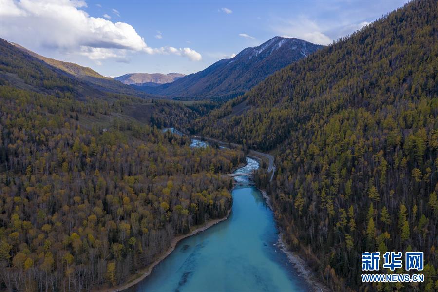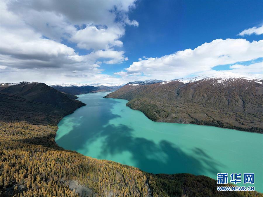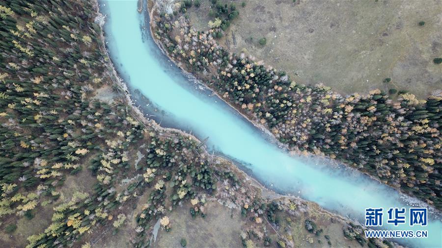 这是9月28日拍摄的喀纳斯秋景(无人机照片)。 “十一”黄金周临近,新疆喀纳斯景区进入旅游旺季。目前,新疆喀纳斯景区已采取多项措施加强旅游服务。 新华社记者 沙达提 摄