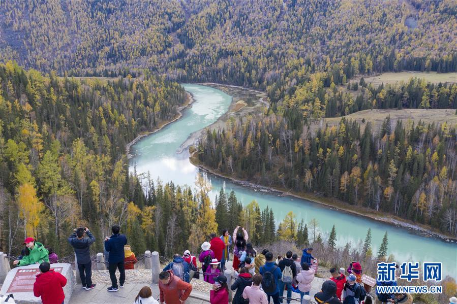 9月28日,游客在喀纳斯月亮湾游玩(无人机照片)。 “十一”黄金周临近,新疆喀纳斯景区进入旅游旺季。目前,新疆喀纳斯景区已采取多项措施加强旅游服务。 新华社记者 沙达提 摄