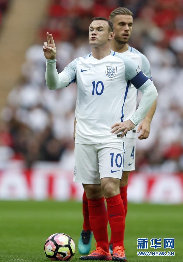 这是2016年10月8日,在英国伦敦举行的2018俄罗斯世界杯欧洲区预选赛F组英格兰队与马耳他队的比赛中,鲁尼(前)在主罚任意球前做手势。 新华社记者 韩岩 摄