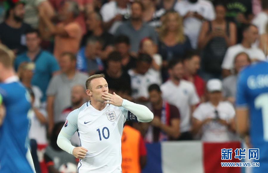 这是2016年6月27日,在法国尼斯举行的欧洲足球锦标赛八分之一决赛英格兰队与冰岛队的比赛中,鲁尼庆祝进球。 新华社记者 白雪飞 摄