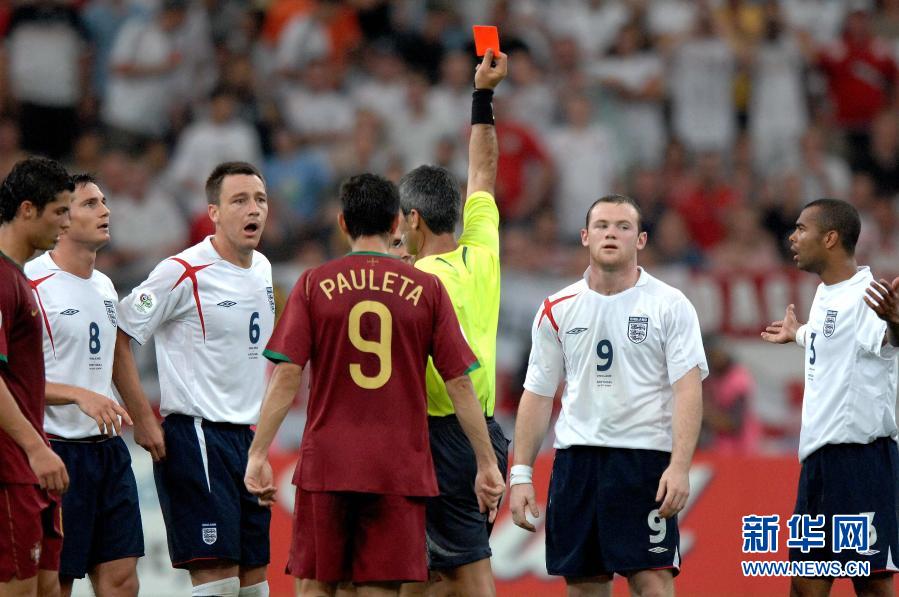 这是2006年7月1日,在德国盖尔森基兴举行的2006德国世界杯四分之一决赛英格兰队与葡萄牙队的比赛中,鲁尼(右二)被红牌罚下。 新华社记者 郭大岳 摄