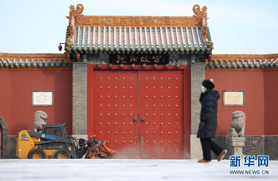 1月13日,一辆除雪车在沈阳故宫宫门前除雪。