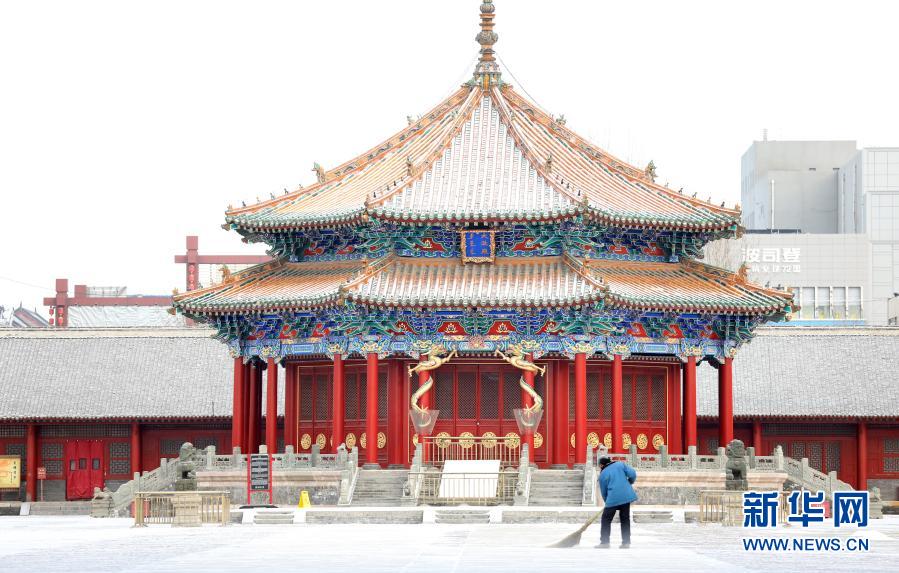 1月13日,一名工作人员在沈阳故宫大政殿前扫雪。