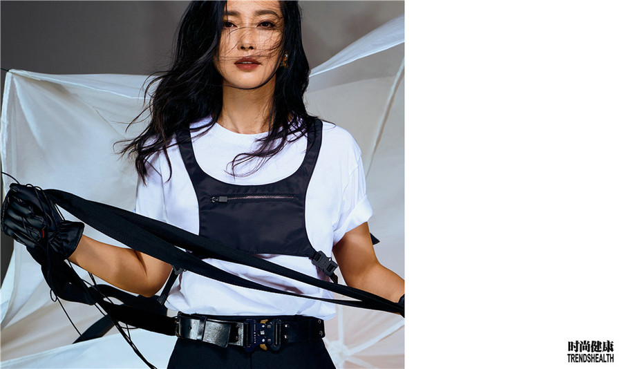 封面中,李冰冰露出手臂线条,自律健康美的状态淋漓尽现,长发恣意飞扬,目光坚定地坐在脚手架上,驭风向上、勇敢攀登的态度闪耀着女性魅力。