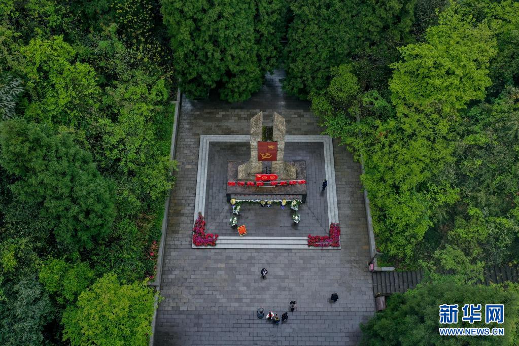 参观者在位于贵州省遵义市习水县土城镇的“青杠坡战斗遗址”内参观(2021年4月22日摄,无人机照片)。新华社记者 欧东衢 摄