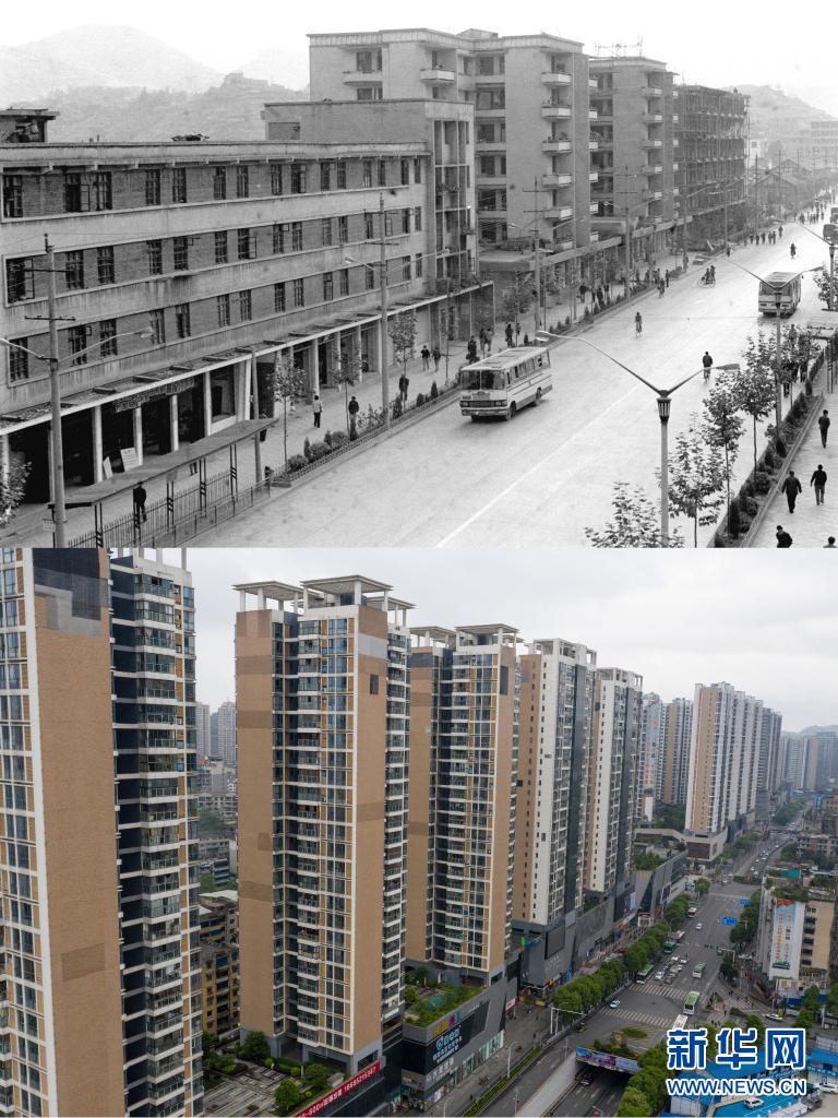 这是一张拼版照片,上图为:1975年6月24日拍摄的贵州省遵义市习水县土城镇(新华社记者周浩荣摄);下图为:2021年4月21日拍摄的贵州省遵义市习水县土城镇(新华社记者欧东衢摄)。新华社发