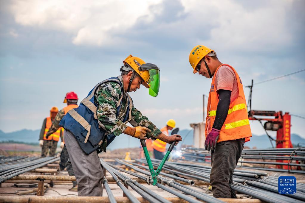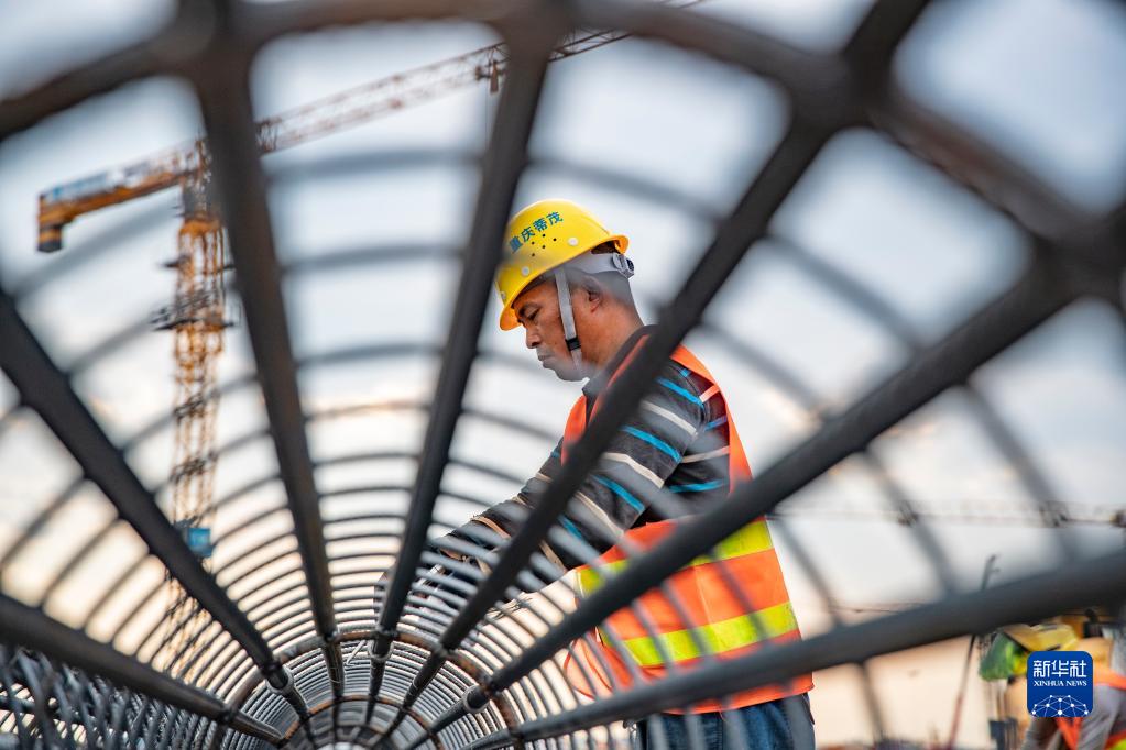 10月4日,施工人员在重庆江北国际机场T3B项目上进行钢筋绑扎作业。 截至目前,由中建八局承建的重庆江北国际机场T3B项目已进入主体施工阶段。连日来,1000余名建设者放弃国庆休息时间,在工地上度佳节、战高温、赶进度,奋战在项目建设一线。 新华社记者 黄伟 摄