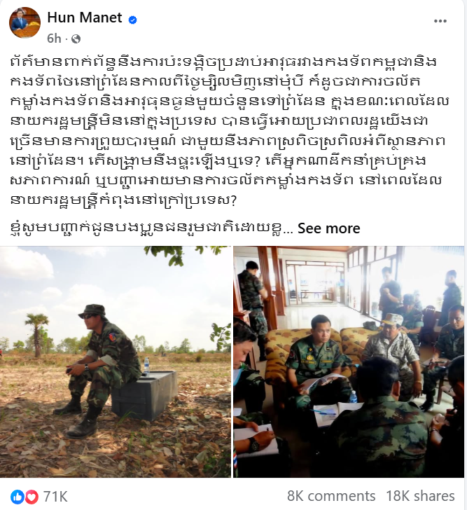 洪玛奈在社交媒体上发文说,“我希望柬泰两国陆军高层今天的会谈能够取得积极成果,一如既往地保持双方前线部队间的和平与良好沟通”。