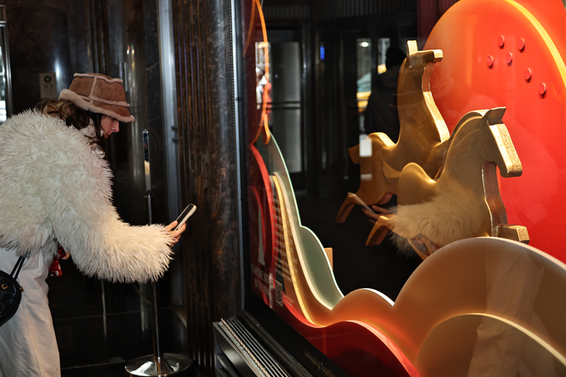 今年的生肖橱窗由中国设计师、北京市文旅局和帝国大厦联袂打造。灵动奔腾的金马缀以葫芦、金桔等中国民俗文化元素,增添了浓浓年味和喜庆氛围。