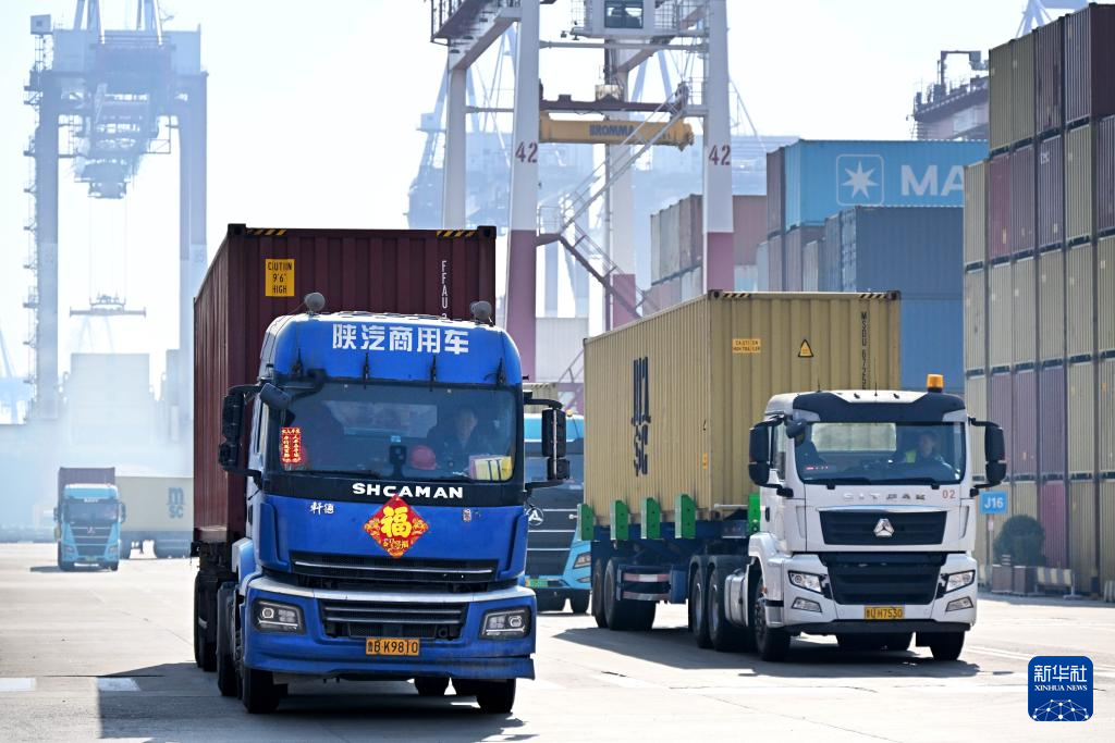 2月18日,卡车在青岛港前湾集装箱码头运送集装箱。新华社记者 李紫恒 摄