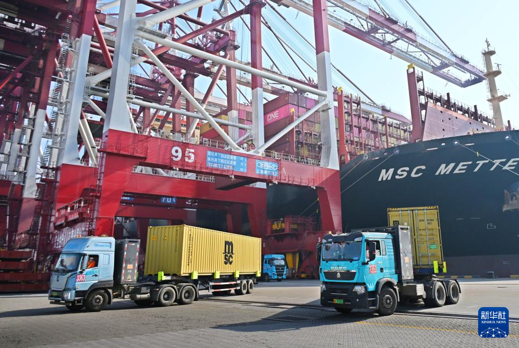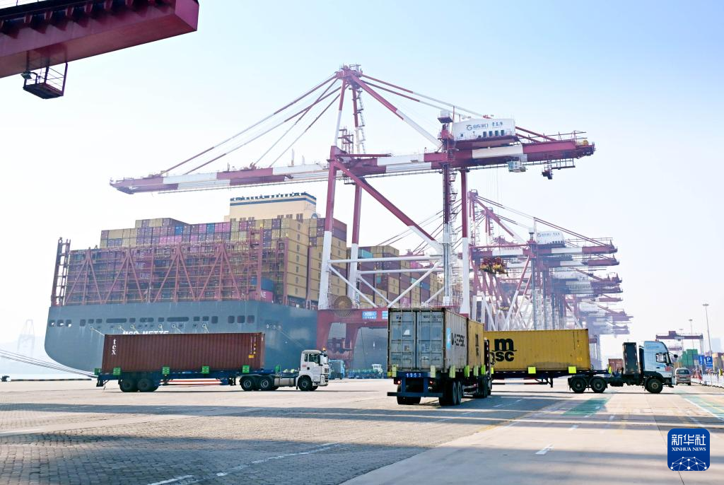 2月18日,卡车在青岛港前湾集装箱码头运送集装箱。 新华社记者 李紫恒 摄