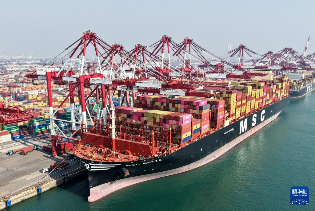 “地中海梅特”轮在青岛港前湾集装箱码头装卸集装箱(2月18日摄,无人机照片)。新华社记者 李紫恒 摄