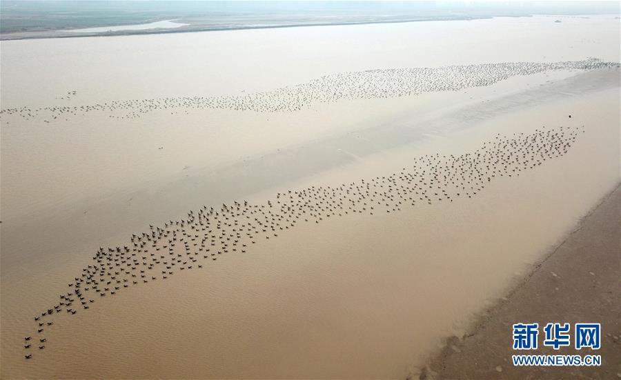 这是2018年12月25日在河南省长垣县境内拍摄的黄河湿地万鸟飞临盛景(无人机拍摄)。新华社记者 冯大鹏 摄