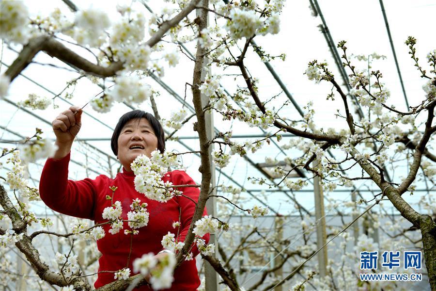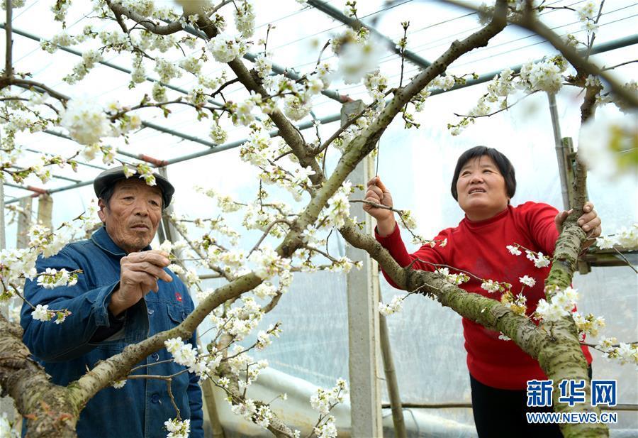 1月14日,枣庄市山亭区郑庄村果农在果树大棚内为盛花期的樱桃树人工授粉。新华社发(刘明祥 摄)