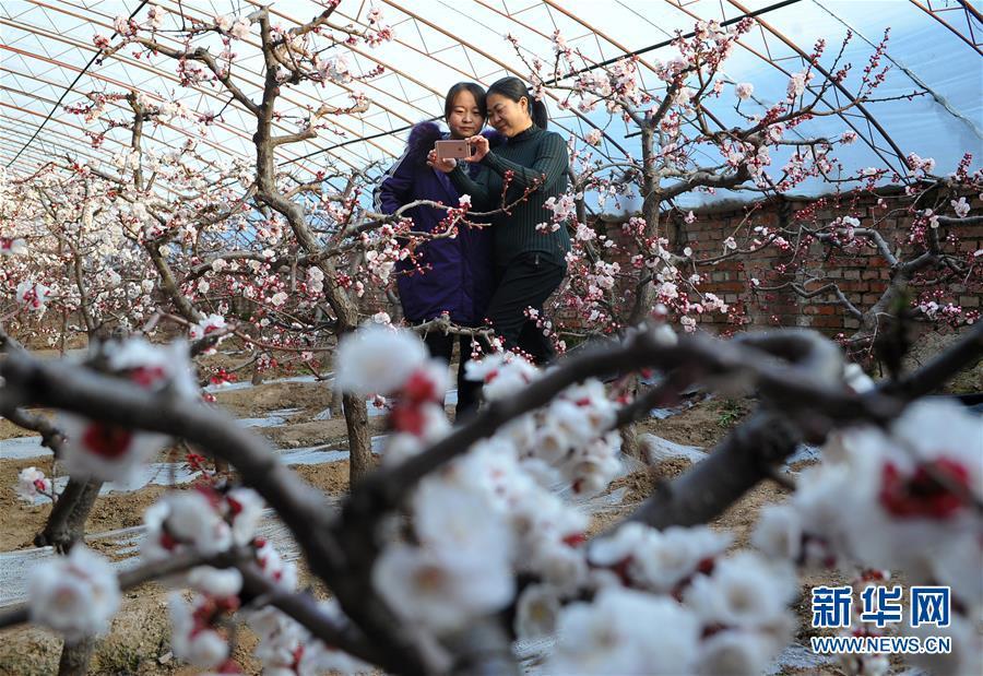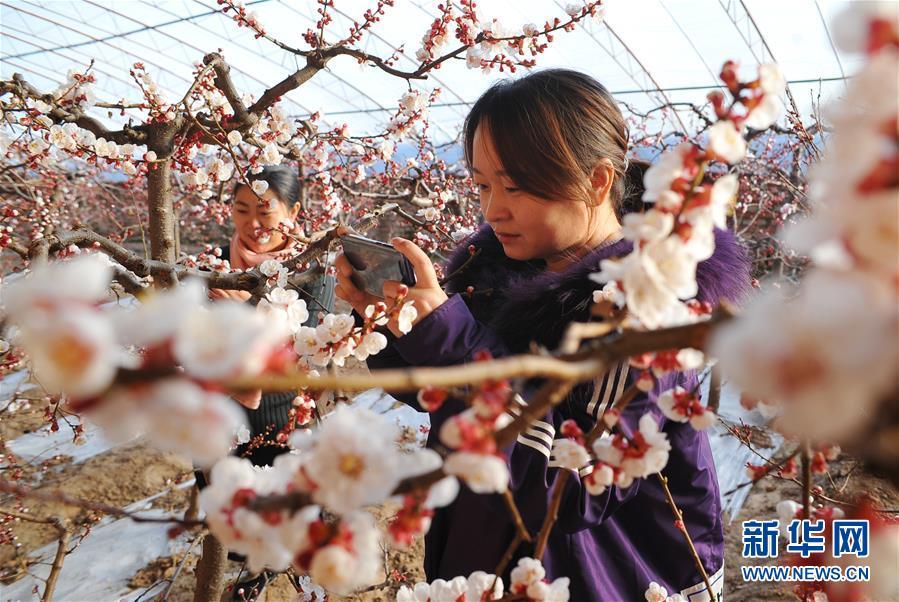 1月15日,游客在张家口市宣化区洋河南镇一种植基地大棚观赏拍摄绽放的杏花。 数九寒天,河北省张家口市宣化区洋河南镇的种植基地大棚春意融融,杏花绽放,吸引游客前来观赏。 新华社发(陈晓东 摄)