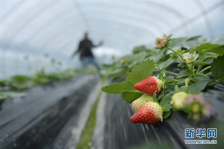 1月14日,宣恩县珠山镇甘溪村农民在草莓大棚内忙碌。新华社发(宋文 摄)