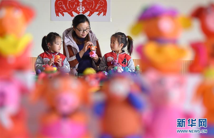 12月27日,山东省淄博市沂源县悦庄镇中心幼儿园的师生在制作卡通萌猪玩具。 当日,山东省沂源县悦庄镇中心幼儿园的小朋友在老师的带领下,用橡皮泥、面粉等材料捏制卡通萌猪玩具,迎接新年的到来。 新华社发(赵东山 摄)