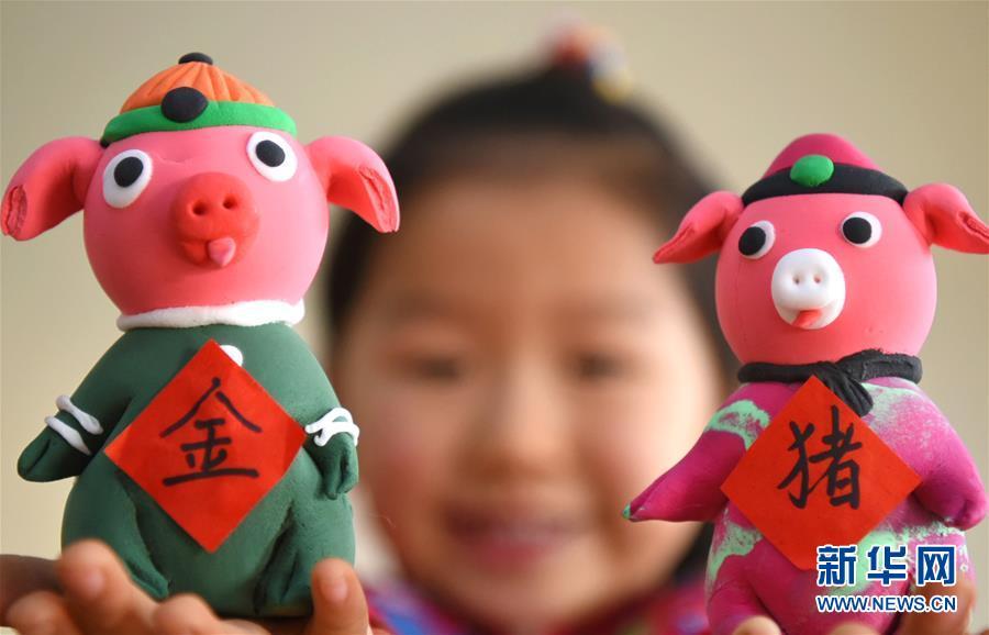 12月27日,山东省淄博市沂源县悦庄镇中心幼儿园的小朋友在展示卡通萌猪玩具。 当日,山东省沂源县悦庄镇中心幼儿园的小朋友在老师的带领下,用橡皮泥、面粉等材料捏制卡通萌猪玩具,迎接新年的到来。 新华社发(赵东山 摄)