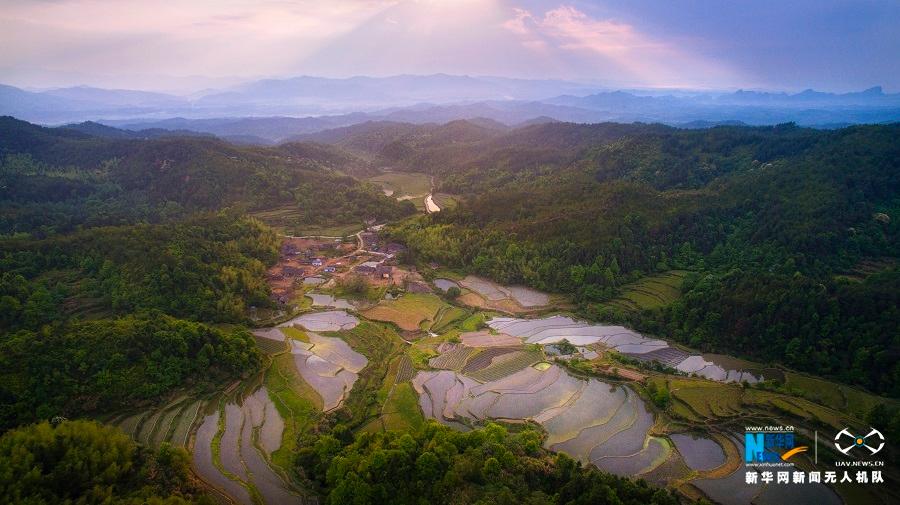 2018年4月21日,在江西省广昌县赤水镇的山丘陵间,层层叠叠的梯田在光影下泛着片片银光,构成了一幅如诗似梦的田园风情画。