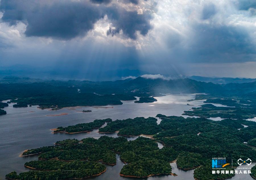 2018年5月1日,航拍雨后的江西省新余市仙女湖山色空蒙,“丁达尔效应”照耀水面美如画卷。