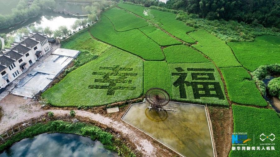 8月26日,在江西婺源瑶湾景区游人如织,小桥流水,湖山映衬,彩色稻田用“幸福”和“奋斗”点缀成一幅美丽的田园生态画卷。