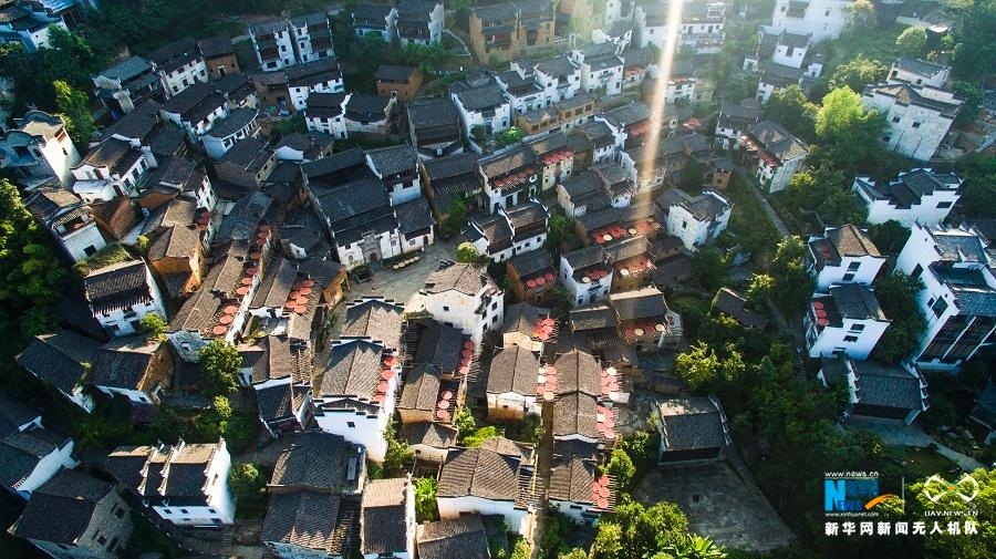 2018年8月7日,在江西婺源篁岭,饱经百年沧桑的徽式民居与晒架上圆圆晒匾里五彩缤纷丰收果实组合,绘就出独特的“晒秋”农俗景观。