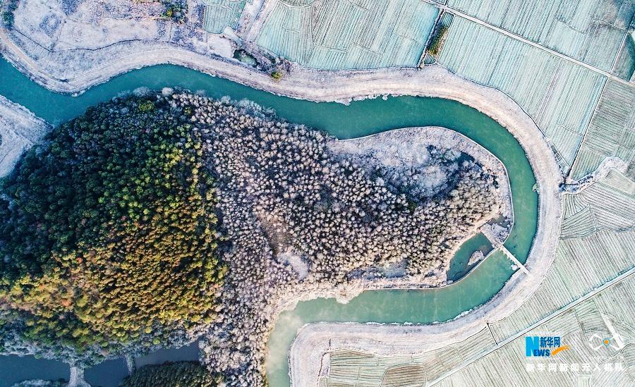 图为2018年1月10日,江西仙女湖河下镇的田野山川被冬霜覆盖,一片地势较低的树林上挂满冬霜,白茫茫的一片如冬雪一般,在阳光照耀下与高处的绿树相互映衬,显现出半林翠色半林白的奇观。