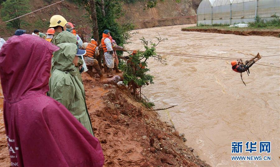 8月8日,在越南西原地区林同省,救援人员用绳索转移被洪水围困的当地居民。 越南中央预防自然灾害指导委员会9日发布消息说,越南西原地区近日遭遇强降雨,暴雨引发的洪水和山体滑坡已造成至少8人死亡。 新华社/越通社
