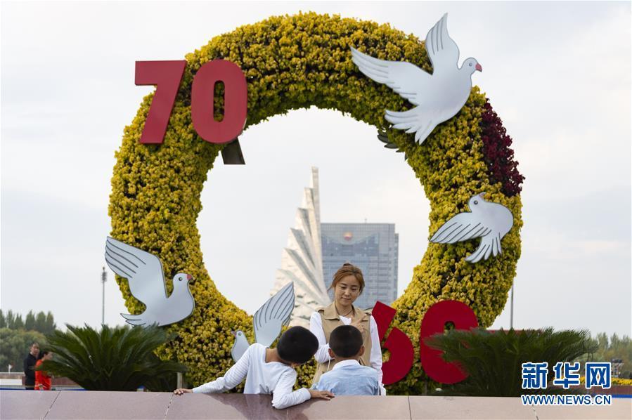 在大庆市让胡路区,家长和孩子在铁人广场前拍照(9月28日摄)。 新华社发(谢剑飞 摄)