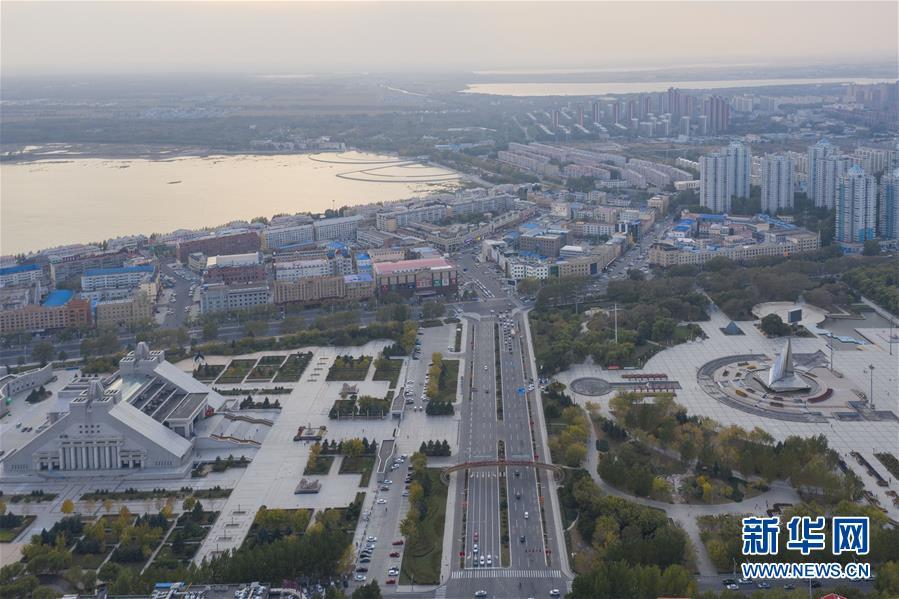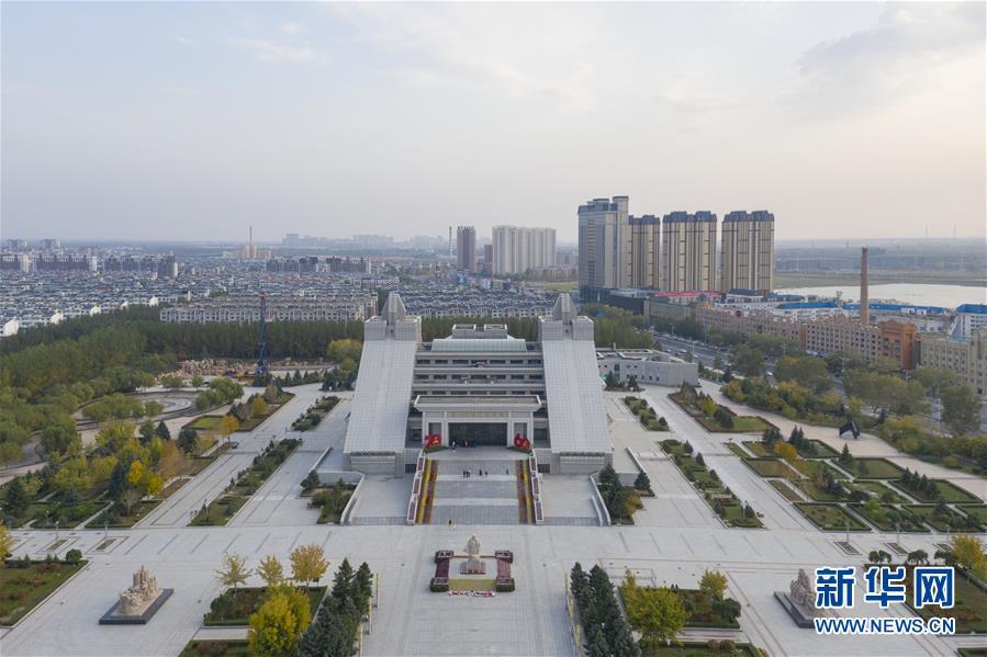 在大庆市让胡路区,铁人王进喜纪念馆(左)和铁人广场(右)分建在中原路南北两侧(9月28日无人机拍摄)。 新华社发(谢剑飞 摄)