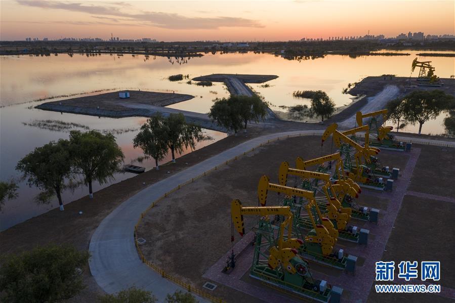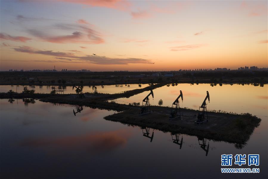 2019年9月26日是大庆油田发现60周年的日子。60年来,大庆油田曾连续27年年产原油5000万吨以上,创造了世界同类油田开发奇迹。目前,大庆油田在四次采油技术、页岩油、天然气等勘探开发方面取得重大进展,进一步夯实了油田高质量发展基础。铁人王进喜“宁肯少活二十年,拼命也要拿下大油田”;大庆“新铁人”王启民“宁肯把心血熬干,也要让油田稳产再高产”;第三代铁人李新民把井打到国外去,“宁肯历尽千难万险,也要为祖国献石油”……大庆精神、铁人精神,成为中华民族伟大精神的重要组成部分,永远是激励中国人民不畏艰难、勇往直前的宝贵精神财富。当好标杆旗帜,建设百年油田。风云激荡一甲子,大庆油田正青春! 图为夕阳中的大庆油田第一采油厂第七油矿503采油队二号丛式井平台井组(9月27日摄)。 新华社发(谢剑飞 摄)