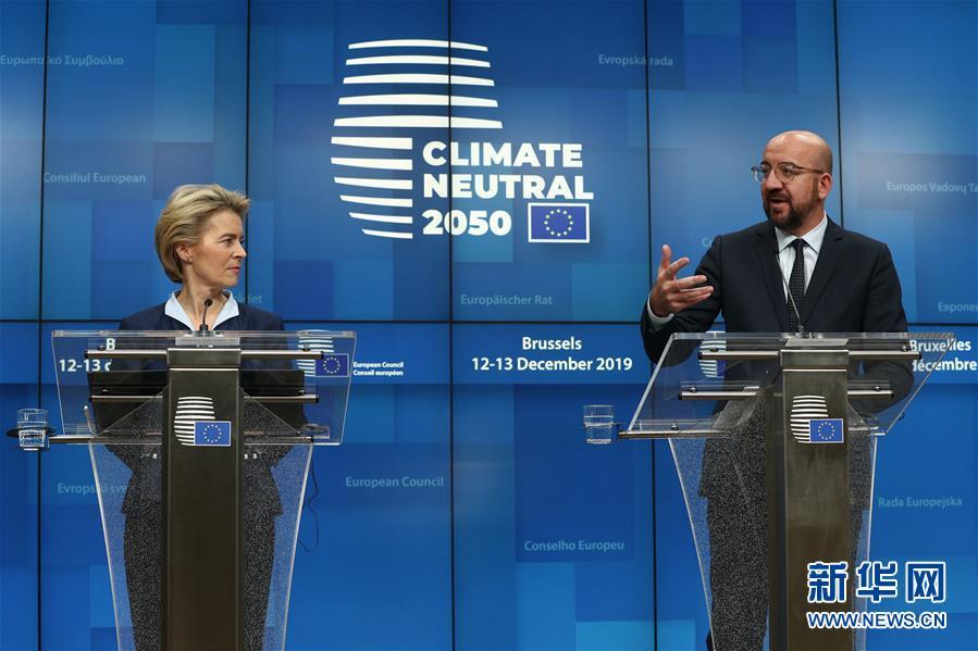 12月13日凌晨,在比利时布鲁塞尔的欧盟总部,欧洲理事会主席米歇尔(右)和欧盟委员会主席冯德莱恩出席新闻发布会。 当天,2019年欧盟冬季峰会新闻发布会在比利时布鲁塞尔的欧盟总部举行。 新华社记者郑焕松摄