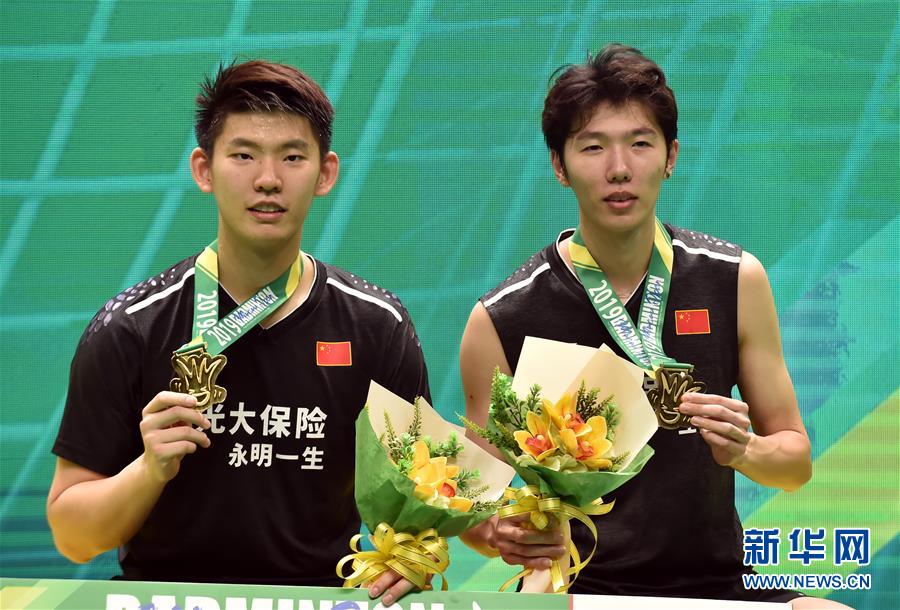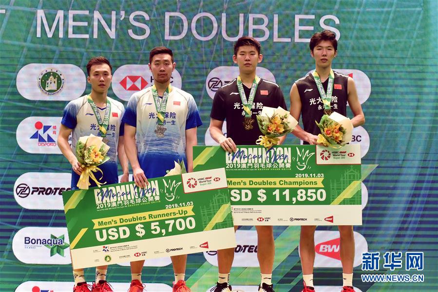 11月3日,李俊慧(右)/刘雨辰在颁奖台上合影。 当日,在2019国际羽联世界巡回赛澳门公开赛男双决赛中,中国组合李俊慧/刘雨辰以2比1战胜队友黄凯祥/刘成,获得冠军。 新华社记者卢炳辉摄