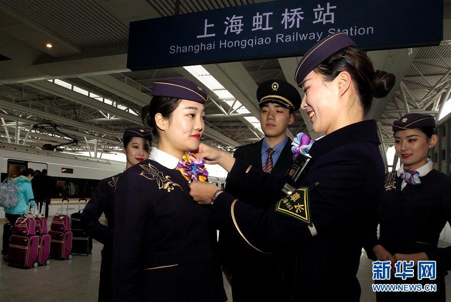 1月2日,在上海虹桥站,列车长封盛(前右)为新任乘务员张丽玲(前左)整理着装。新华社记者 陈飞 摄