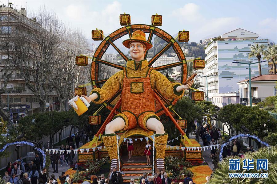 这是2月20日在法国芒通拍摄的用柠檬和橙子做成的街头艺术装置。第87届芒通柠檬节于2月15日至3月3日在法国南部小城芒通举行。今年的主题是“世界的节日”。新华社发(塞尔热⋅阿乌兹摄)