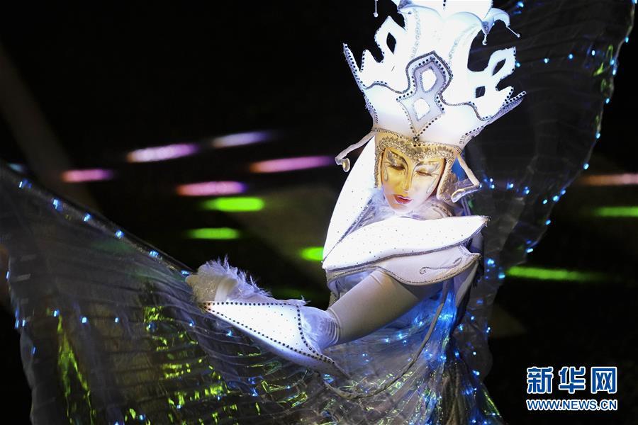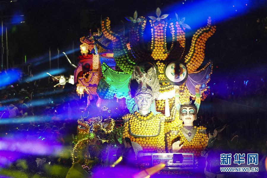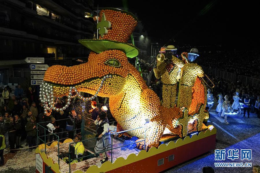 2月20日,在法国芒通柠檬节上,演员在夜间花车巡游上表演。新华社发(塞尔热⋅阿乌兹摄)