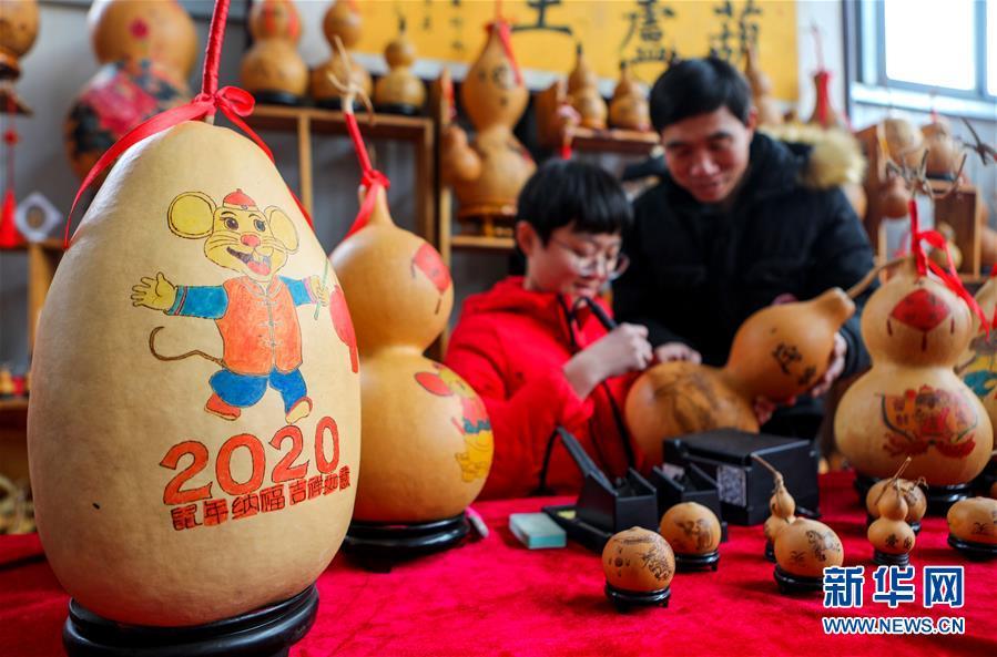 1月21日,在河北省邯郸市鸡泽县,民间艺人任进利在教小朋友葫芦烙画技巧。 近日,河北省邯郸市鸡泽县“葫芦烙画”民间艺人任进利,在葫芦上运用烙画传统技艺烙出鼠年生肖的吉祥图案,迎接新春佳节。 新华社记者 王晓 摄