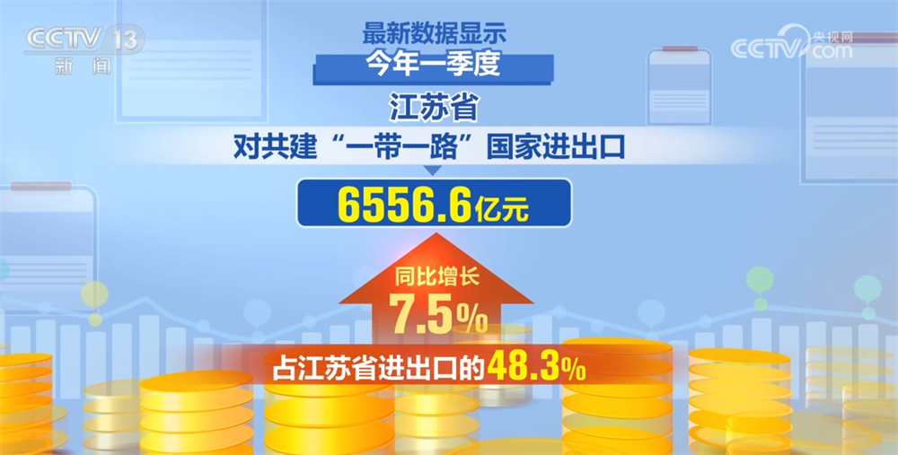 最新数据显示,今年一季度,江苏省对共建“一带一路”国家进出口6556.6亿元,同比增长7.5%,占江苏省进出口的48.3%。